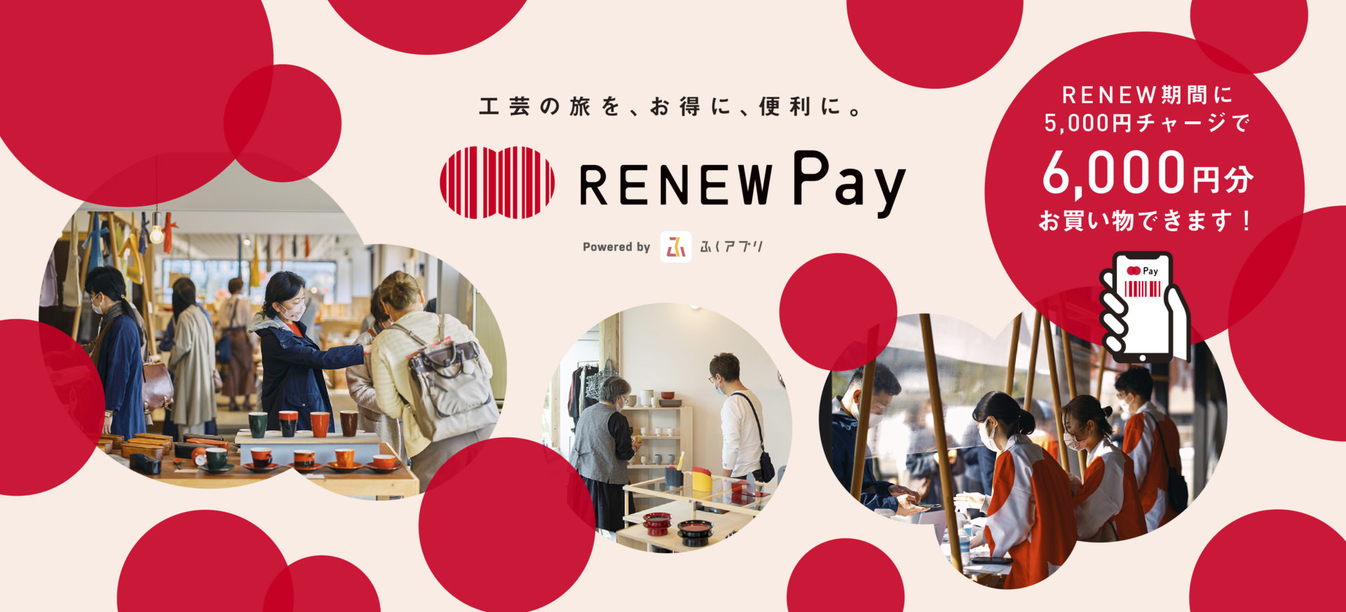 RENEWPayチャージ券6000円分を1口5000円で販売、株式会社ふくいのデジタルが10月から運営開始するスマートフォンアプリ「ふくアプリ」(https://fukuappli.jp/)をダウンロードしていただくと、RENEWでの物販や工房体験・見学の支払いにご利用できます。